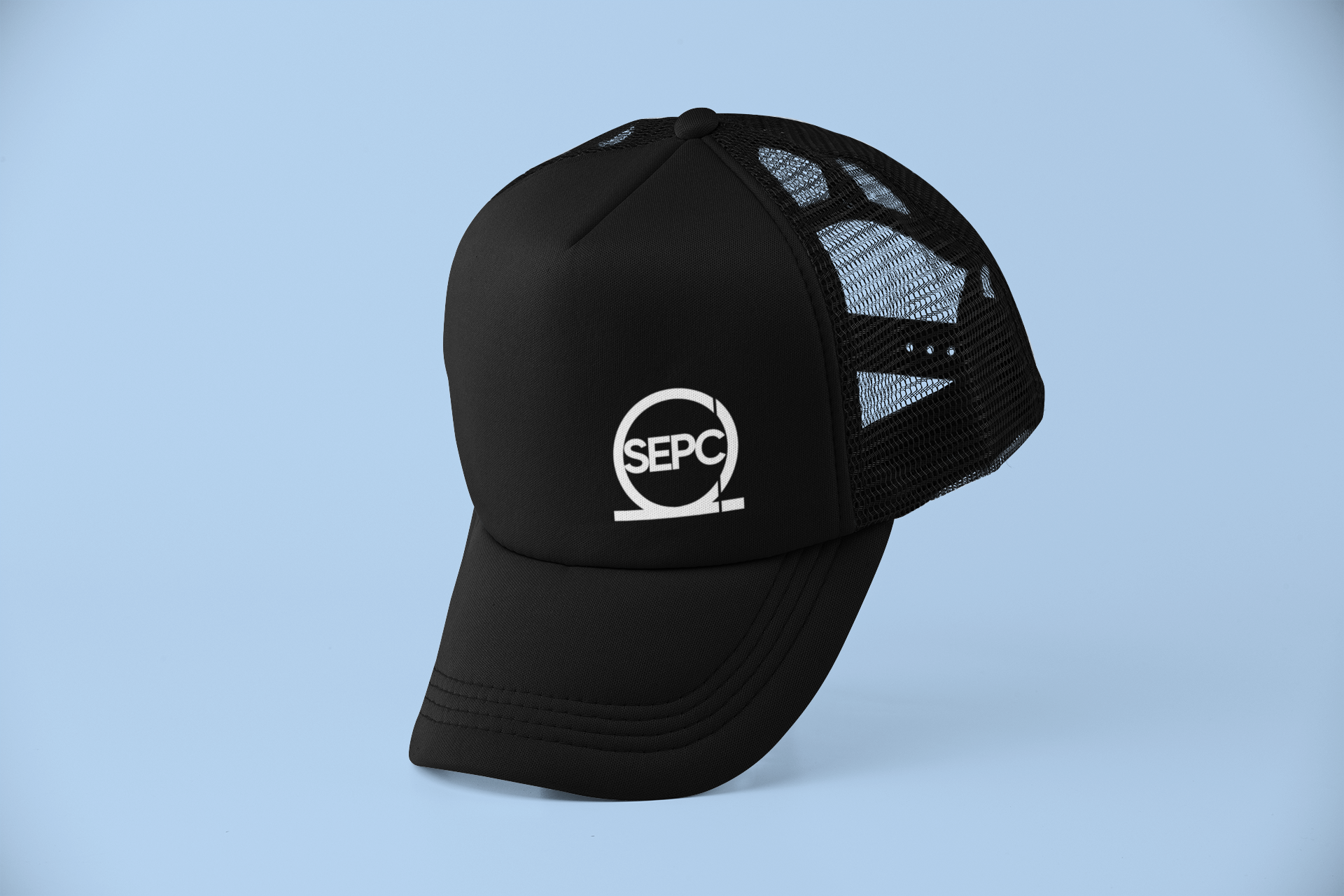 All black trucker hat with the Samuel EPC shin logo (SEPC). One size fits all.